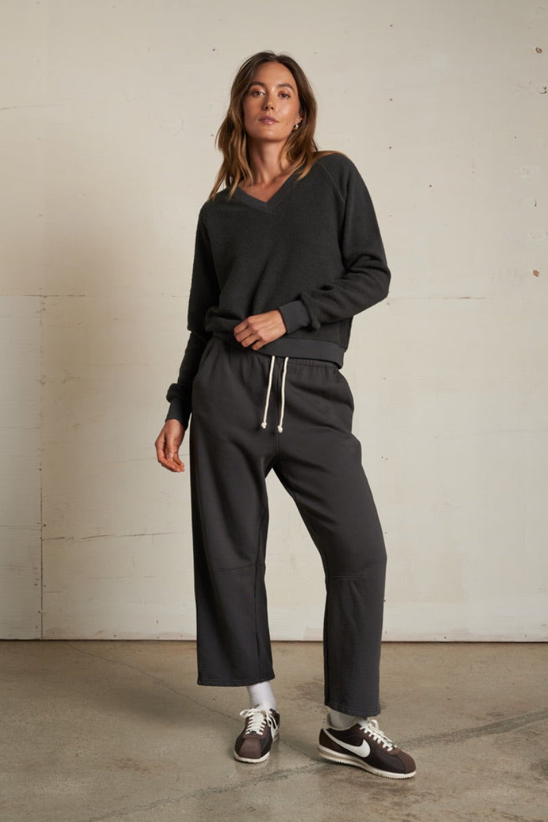 The fallon pant is made from heavy fleece and designed to be the sweatpant that has it all. with side pockets, a pull-on waist with natural drawcord tie, and a barrel leg that tapers into a straight, slightly cropped finish, this bottom is equal parts practical and flattering.