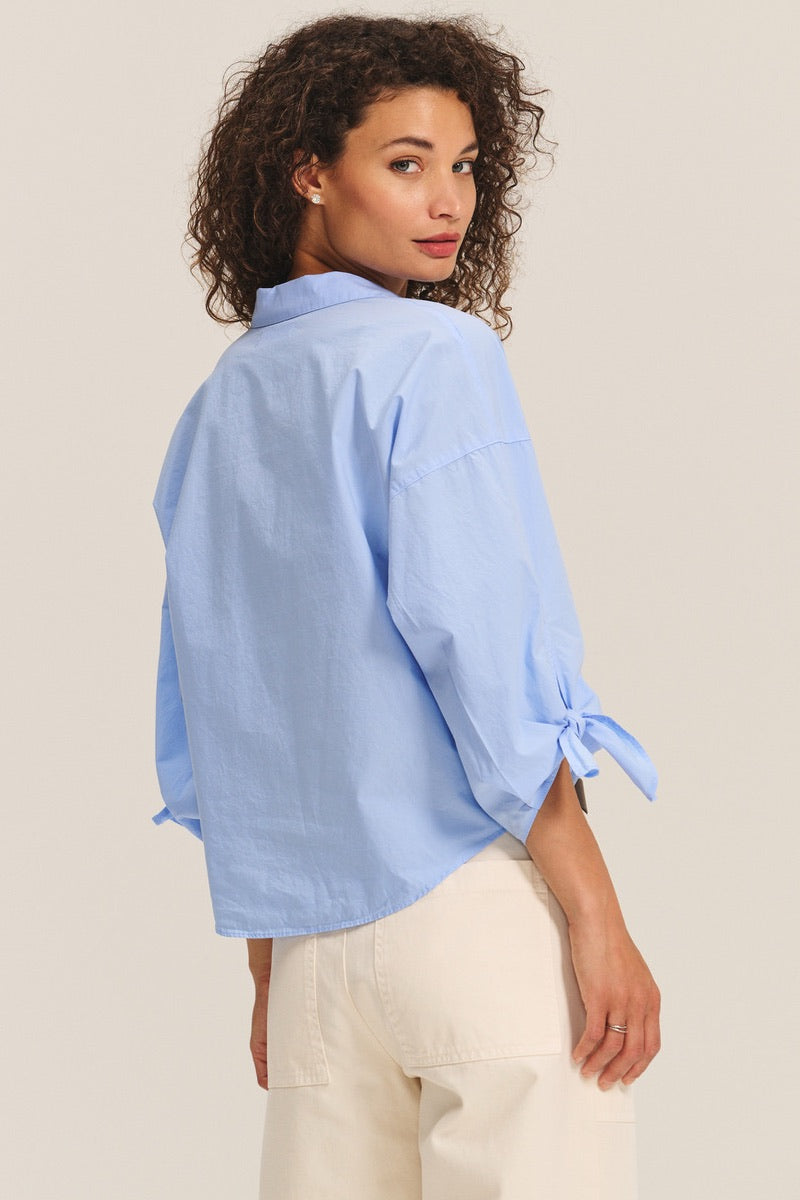 The Arlette Cotton Poplin Top offers a touch of French style with its sweet tie sleeves, perfect for those who prefer not to roll them up. Made from soft and breathable cotton poplin, this top ensures comfort and a classic look for any occasion.