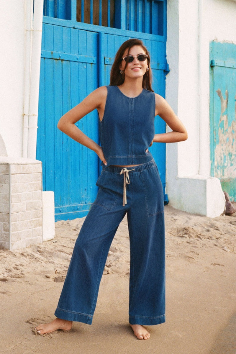 Count us in for ultra soft denim made of 100% cotton. These wide leg pants feature patch pockets, drawcord waistband and midweight feel to them. Dress it up or down with its matching top or a simple tank.