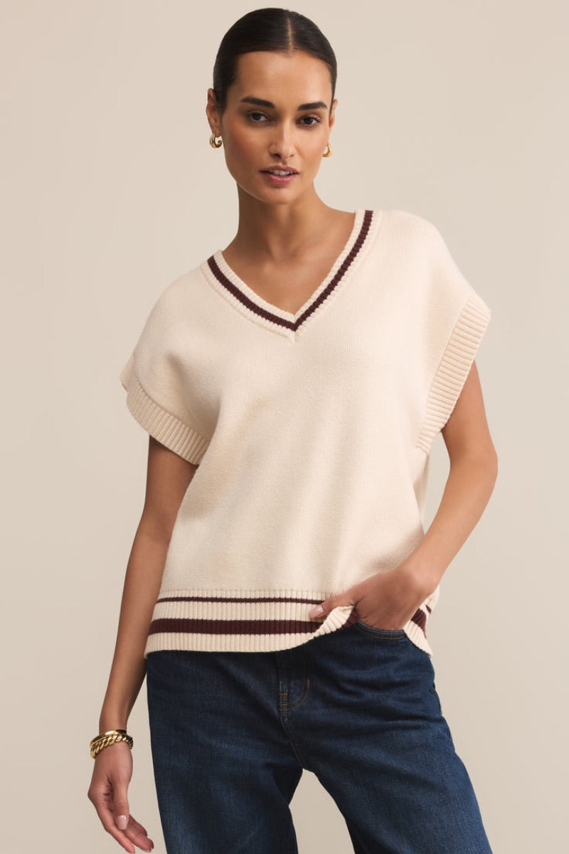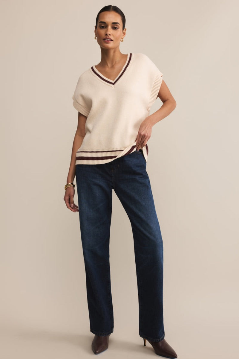 Varsity-inspired and full of texture, this jacquard knit vest features contrast stripes and a flattering v-neckline. Made with our lush jacquard, it’s midweight and easy to throw on over your fave button-up with denim or relaxed trousers.