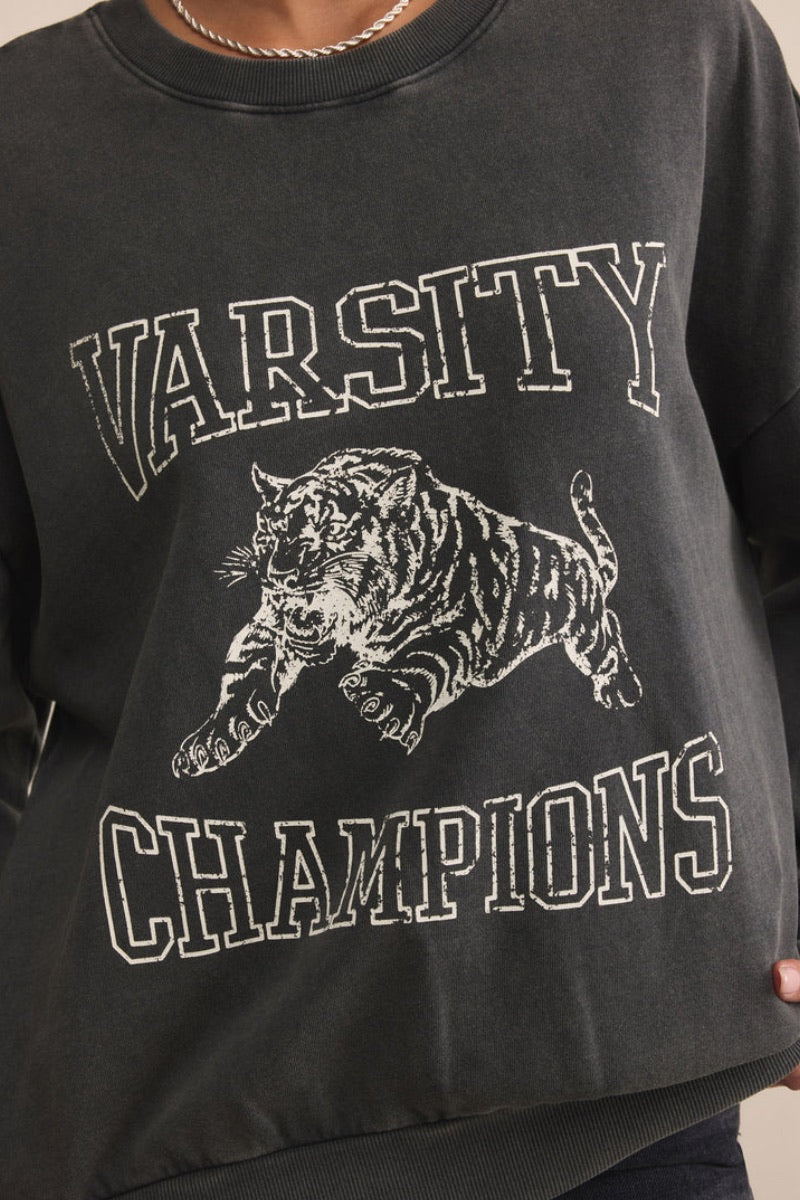 Say hello to your new favourite layer. This oversized fleece sweatshirt is made for downtime, featuring a vintage-inspired “Varsity Champions” tiger graphic that brings bold energy to laid-back looks.