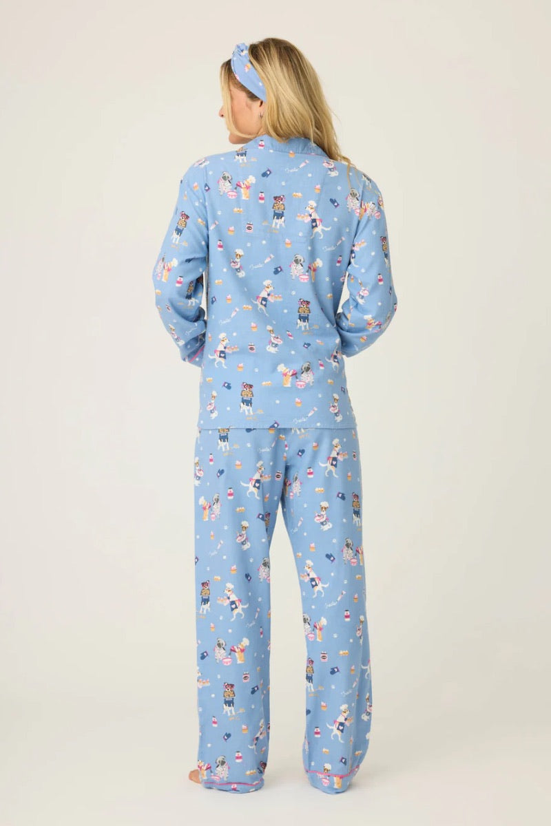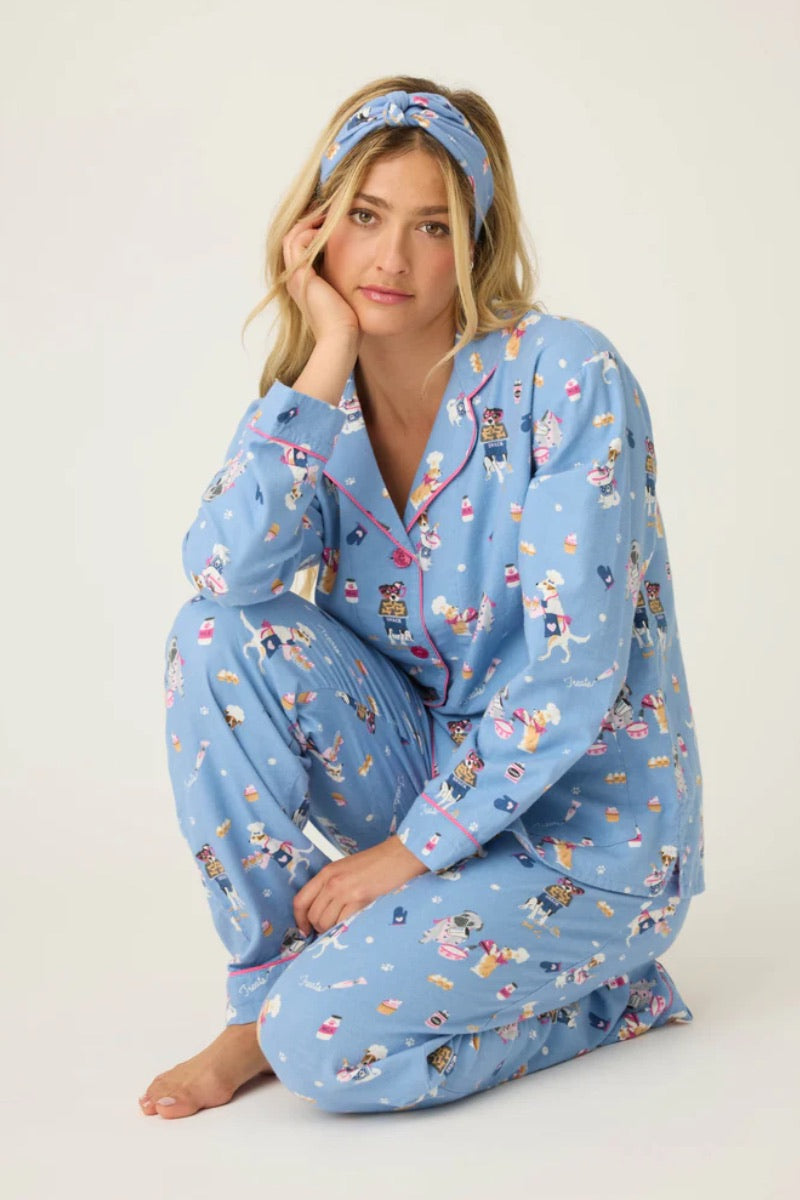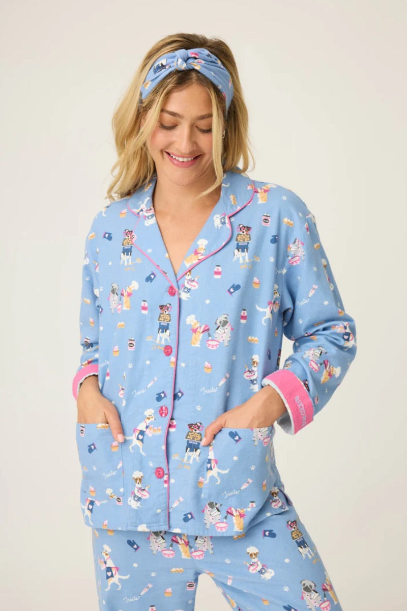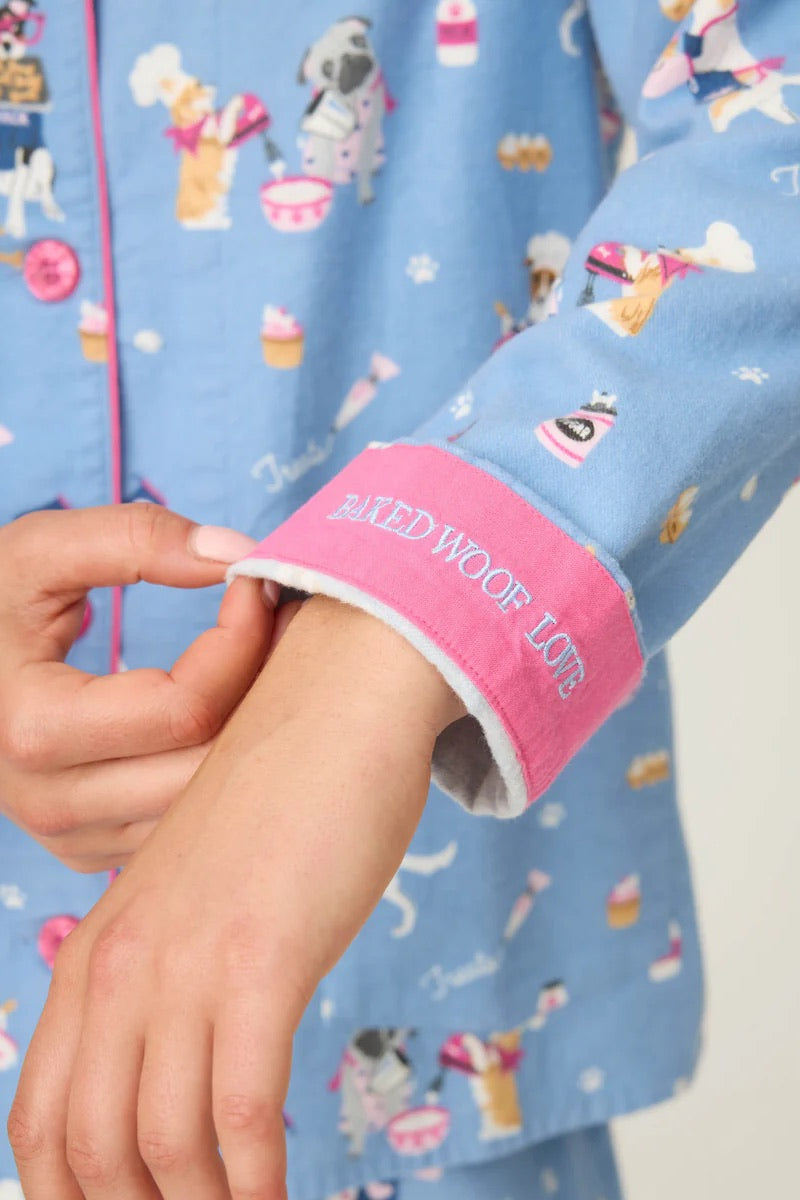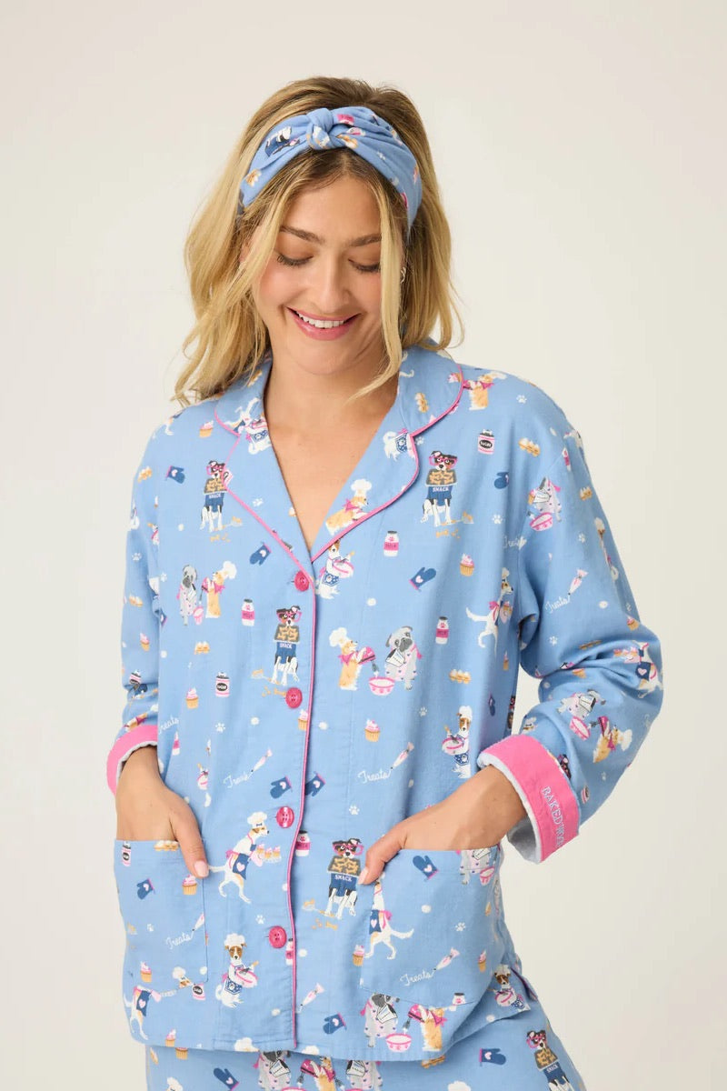 Dormez, détendez-vous et répétez l'expérience avec cet ensemble trois pièces en flanelle de rêve. Confectionné en coton doux au tissage sergé classique, il comprend une chemise boutonnée, un pantalon ample et un bandeau assorti pour compléter le tout. Le tissu bleu doux est parsemé de chiots préparant des cupcakes, d'empreintes de pattes ludiques et de dessins de cuisine, apportant une touche de légèreté à votre lit.