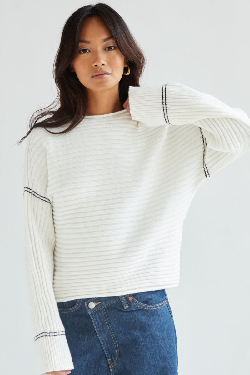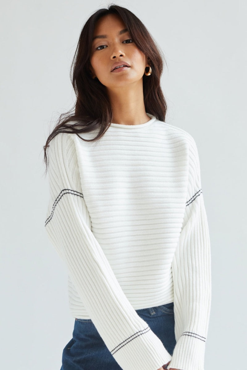 Maille texturée légèrement raccourcie avec détails de coutures contrastées : un incontournable de la garde-robe de saison. Parfait avec un jean ou un tailleur léger pour des looks décontractés raffinés.
