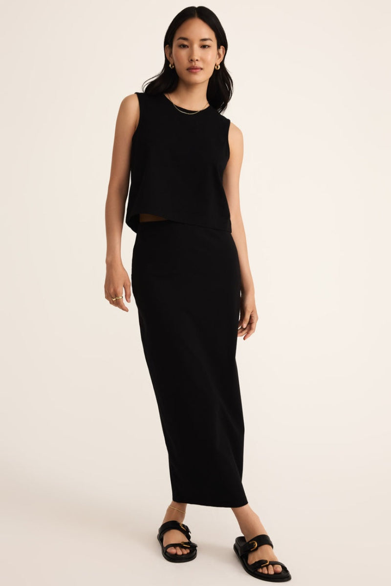 Sleek and simple, this body-skimming midi skirt is fitted at the waist with an elastic waistband for all-day comfort. Crafted from soft cotton jersey fabric, it’s the perfect versatile piece for any wardrobe.