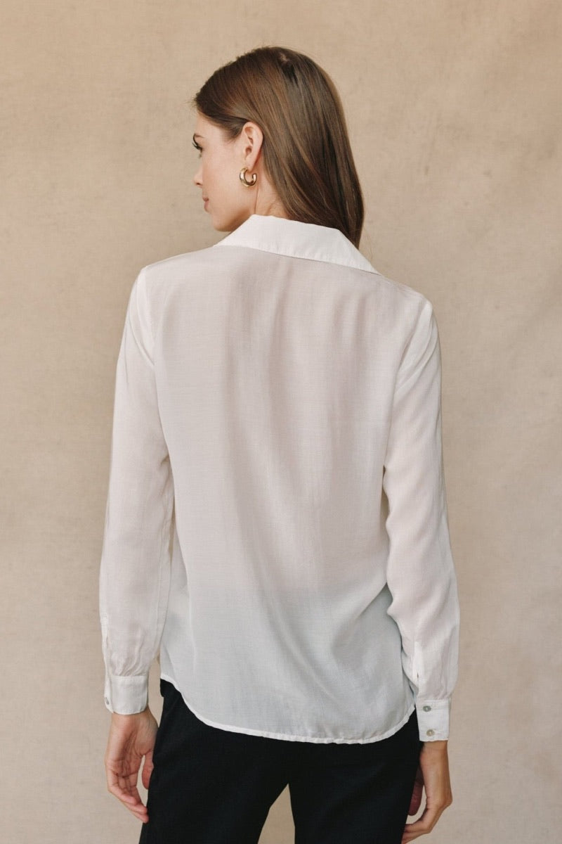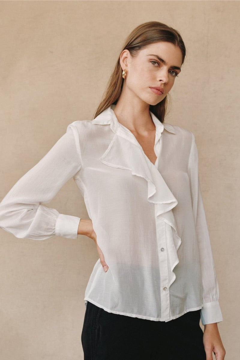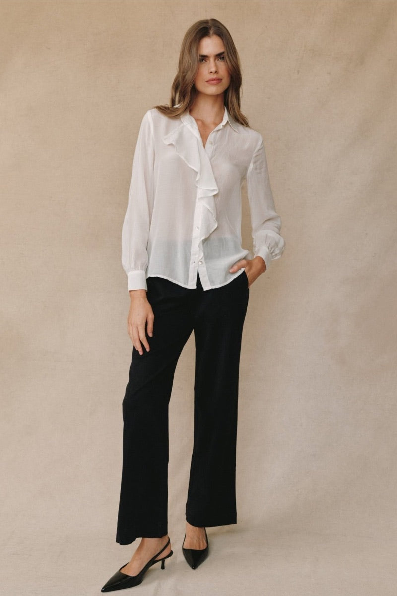 La chemise à volants sur le devant est un essentiel moderne conçu pour un port quotidien sans effort.