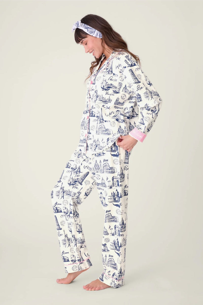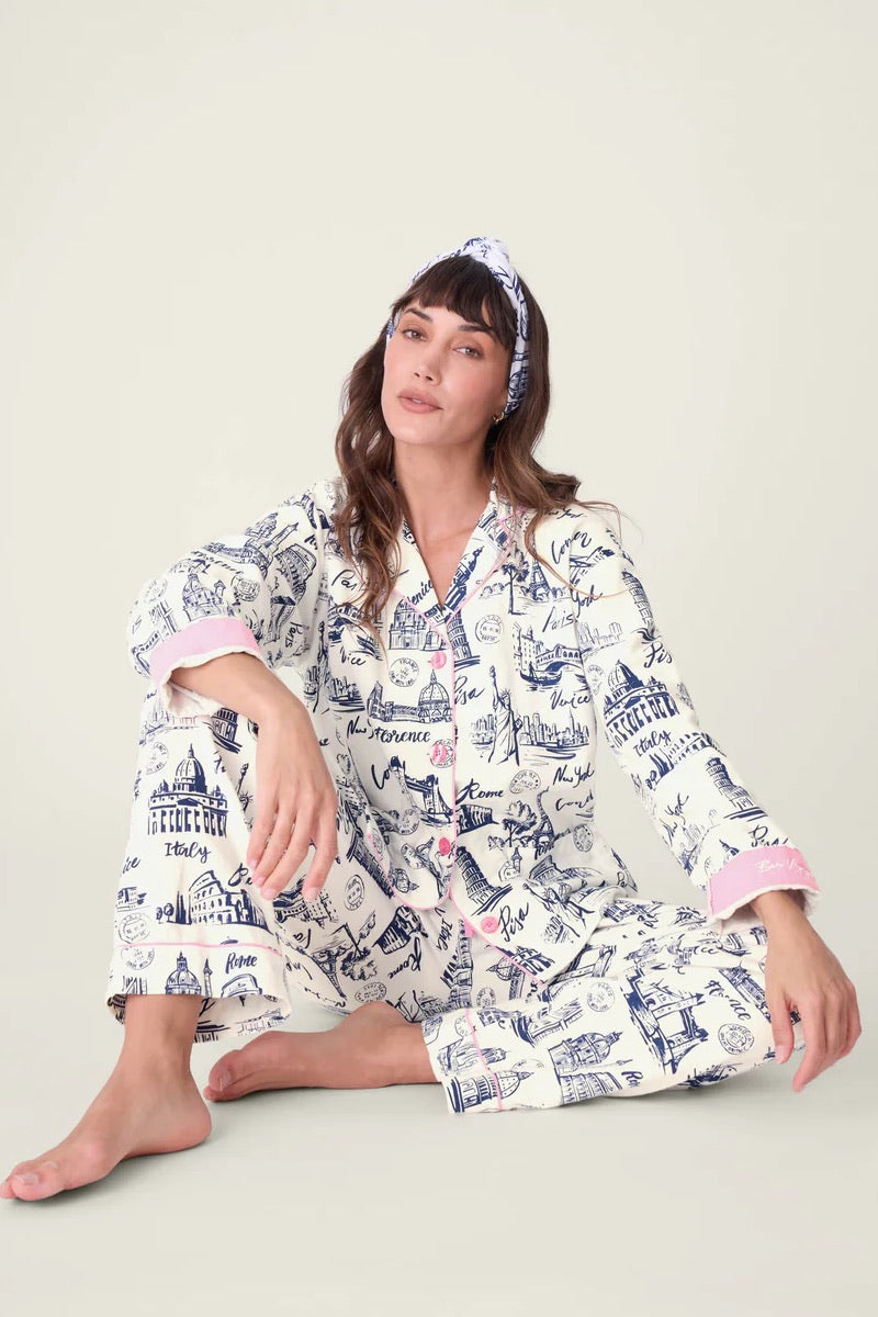 • Ensemble pyjama 3 pièces pour femme en blanc avec imprimé de monuments urbains bleu marine.