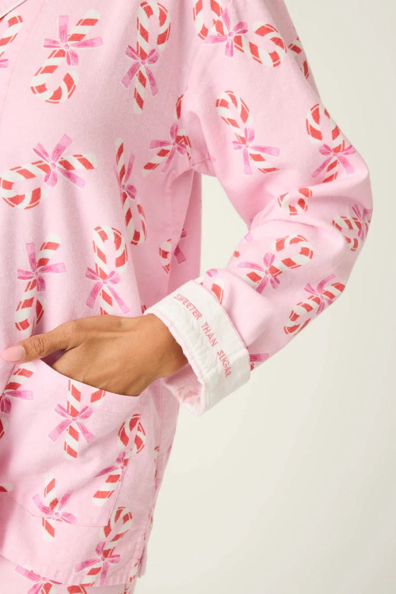 Sweeten your holiday season in this cotton flannel pajama set, scattered with candy canes tied up in pink bows. The three-piece design includes a button-down top with contrast piping, relaxed drawstring pants, and a matching headband—made for movie marathons, peppermint cocoa, and cozy mornings that stretch into afternoons.