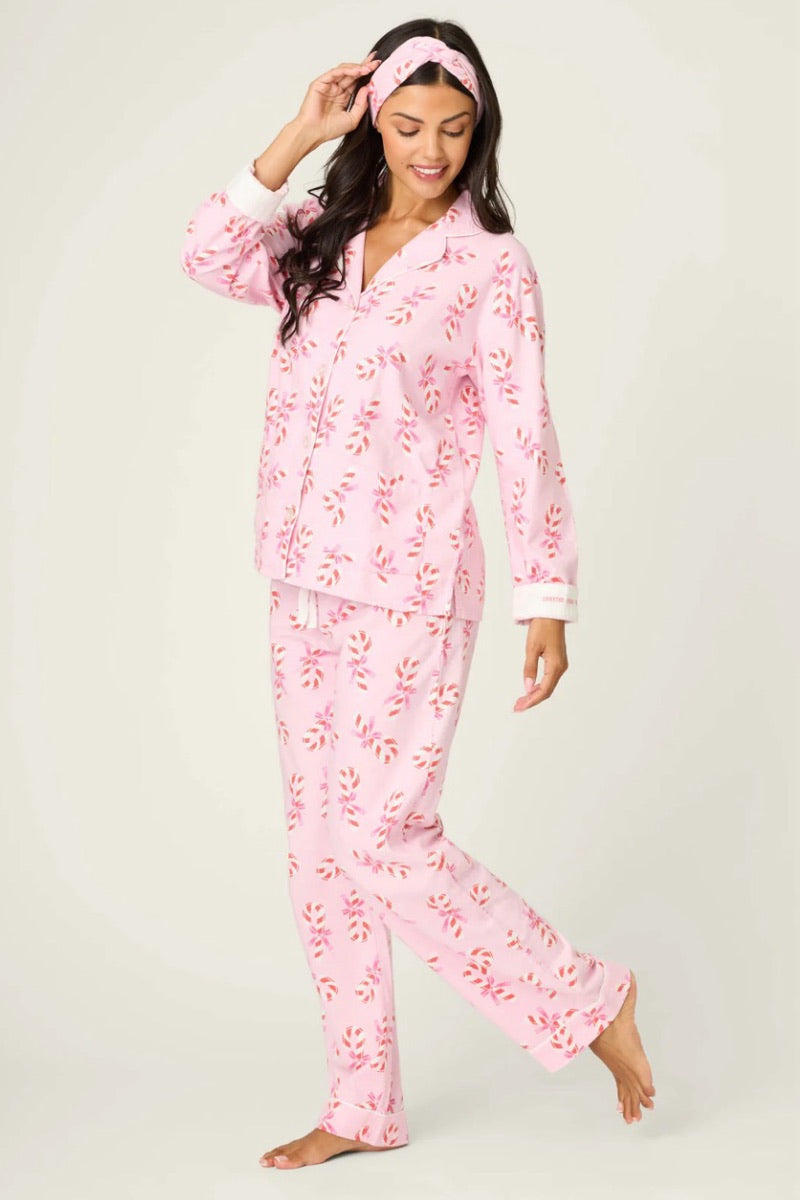 Women’s pink cotton flannel pajama set with holiday candy cane print, button-down top with contrast piping, relaxed drawstring pants, and matching headband.