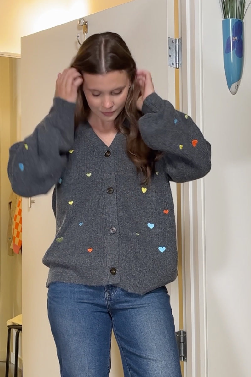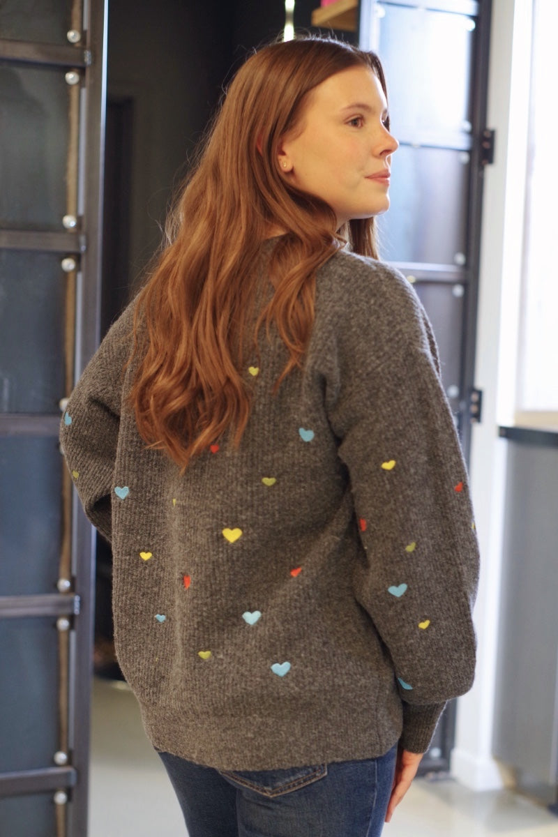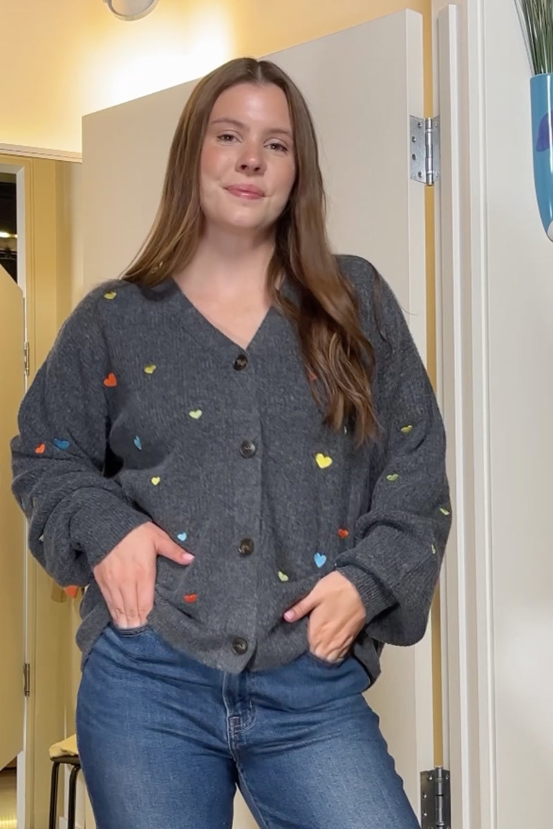 This is the cutest cozy cardigan with whimsical embroidered hearts all around.  Pair with your fave jeans or cozy track pants