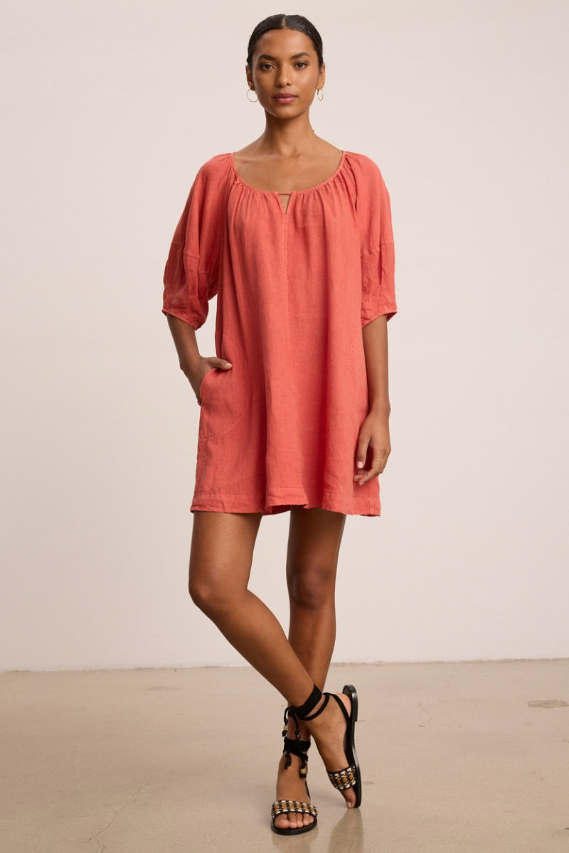 A light and airy mini dress made from breathable linen and finished with half-length puff sleeves and an optional belt.